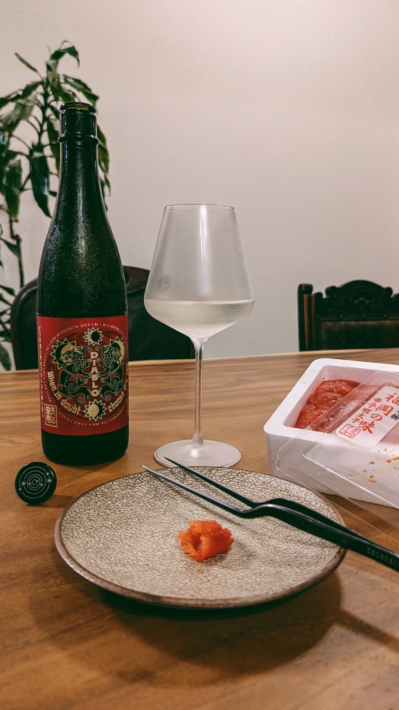 但是福岡×福岡的聯手還必需是用辣明太子來搭才有意義。魚卵醇厚飽滿,微辣辛香刺激味蕾的活躍,瞬間引起食慾,帶著海洋鮮味的明太子經過醃漬之後的鮮鹹悠長,搭配上飽滿辛口的酒,帶來爽冽的收尾,究竟會先停下筷子,還是停下酒杯?